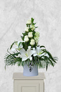 Los lirios blancos representan la renovación espiritual y el descanso en paz, mientras que las rosas blancas expresan amor puro y respeto profundo. La composición en tonos blancos transmite serenidad, cercanía y un mensaje de luz para despedir con dignidad a un ser querido.