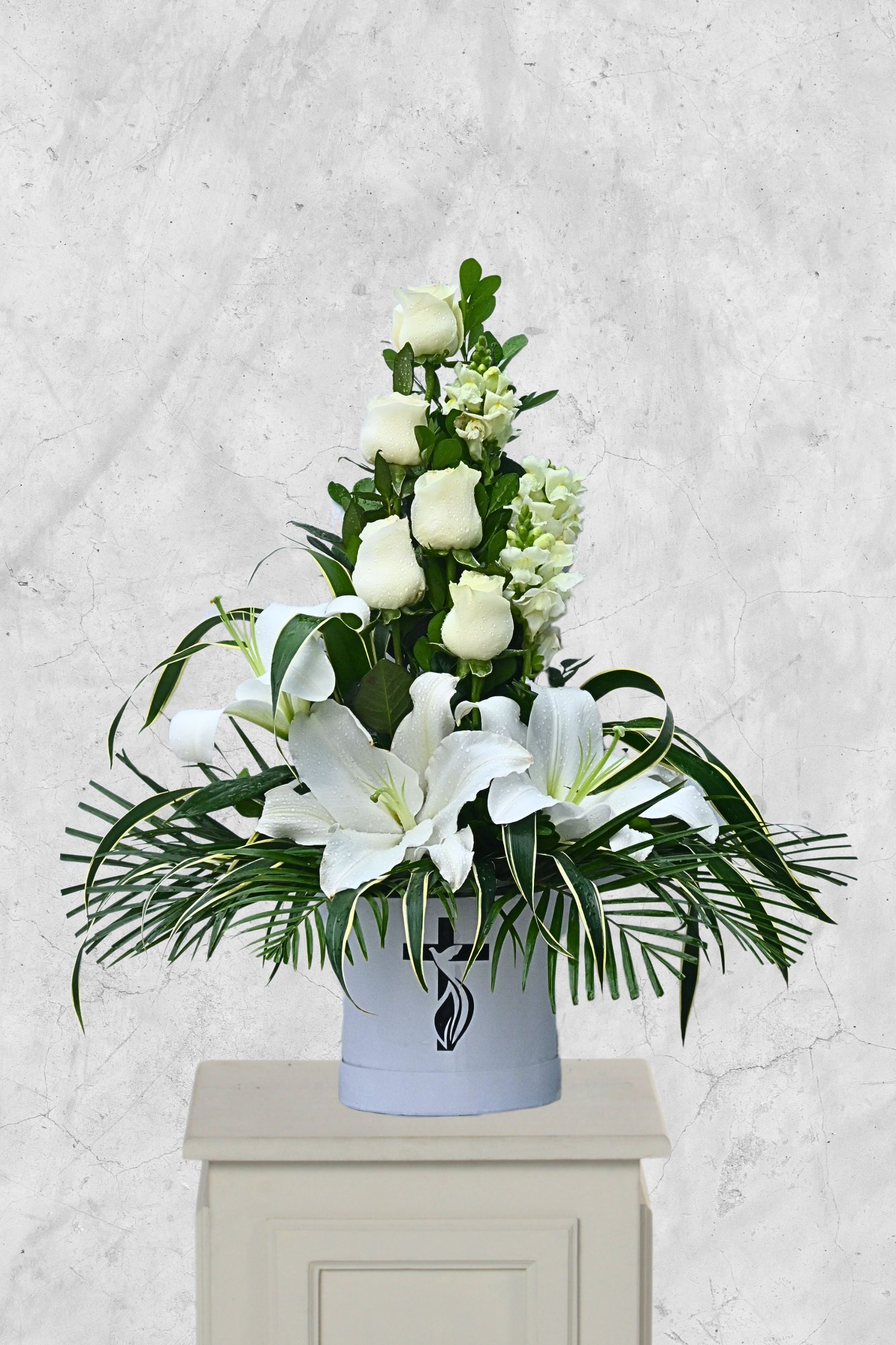 El Arreglo de Luz Celestial Blanca es un homenaje elegante y lleno de serenidad, pensado para transmitir consuelo y acompañar con respeto en momentos de despedida. Su diseño combina rosas blancas y lirios blancos como símbolo de pureza y amor eterno, complementados con flores de boca de dragón y follaje natural que enmarcan el arreglo con armonía. La base blanca con símbolo religioso refuerza el mensaje espiritual y de luz.