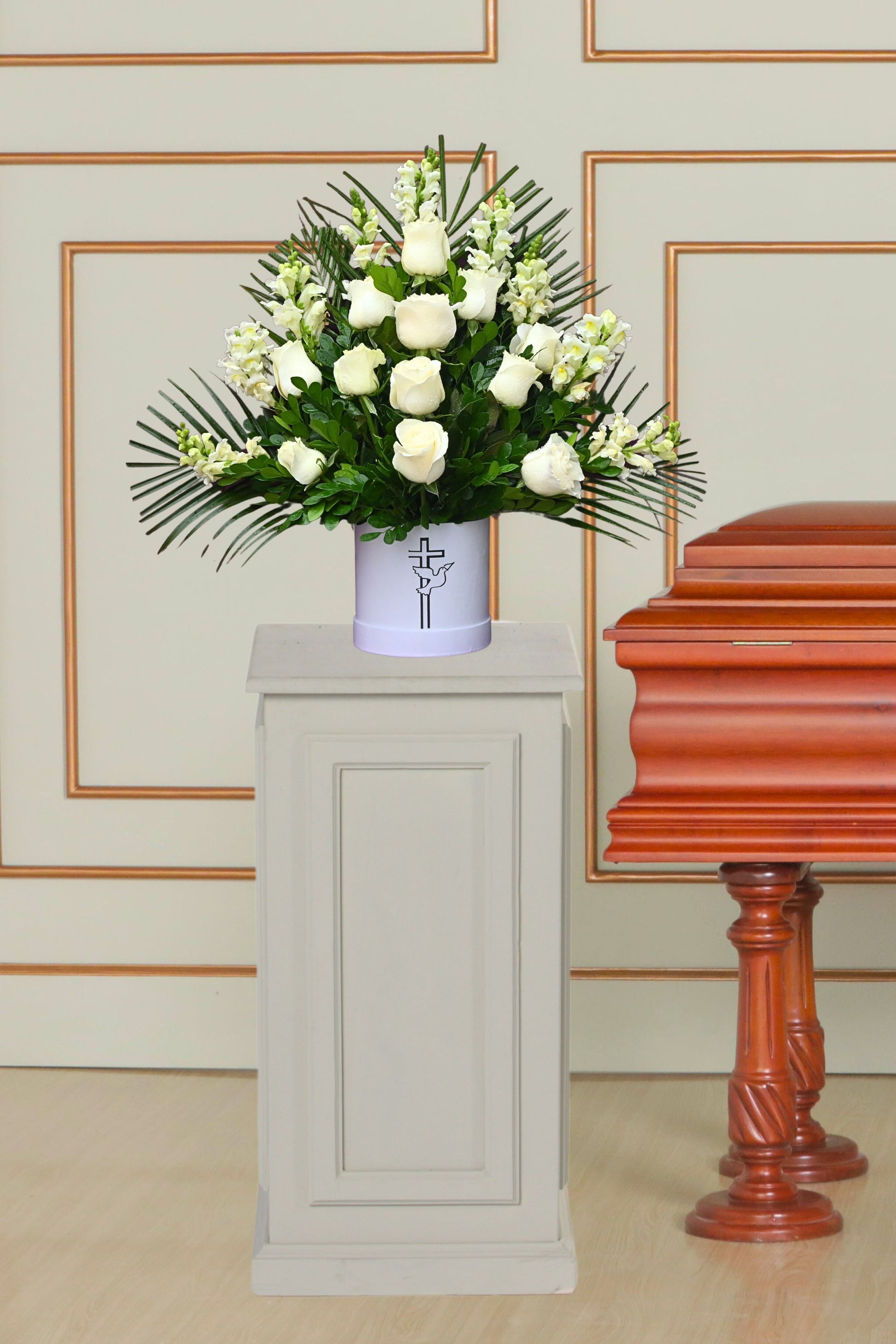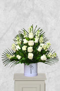 El Arreglo Abrazo de Paz Blanca es un tributo elegante y sereno, diseñado para acompañar en momentos de despedida con respeto y empatía. Su composición armoniosa de rosas blancas y flores de boca de dragón en tonos crema, enmarcadas con follaje verde natural, crea un diseño equilibrado que transmite paz y consuelo. La base blanca con símbolo religioso refuerza el mensaje espiritual y de descanso eterno.