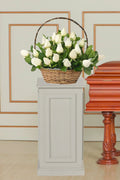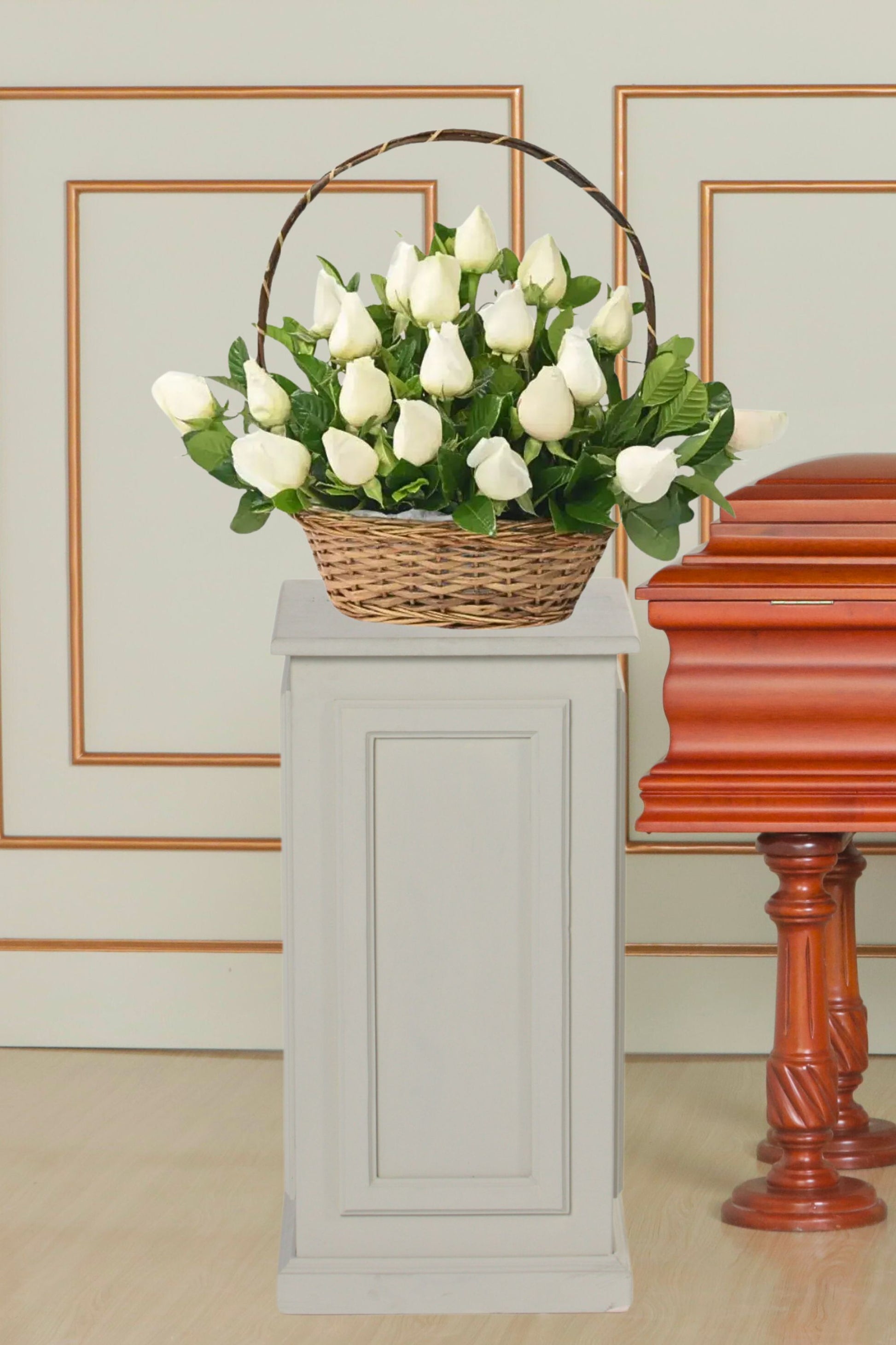 El blanco simboliza paz, amor eterno y luz espiritual. Las rosas expresan cariño profundo y respeto, mientras el cesto representa cercanía y acompañamiento cálido. Este arreglo busca transmitir un mensaje de solidaridad y consuelo, honrando la memoria del ser querido con suavidad y dignidad.