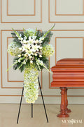 Ideal para funerales y ceremonias religiosas en Lima y Callao. Este arreglo floral expresa un gesto sobrio y respetuoso, ofreciendo consuelo y paz en la despedida de un ser querido.