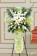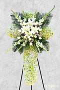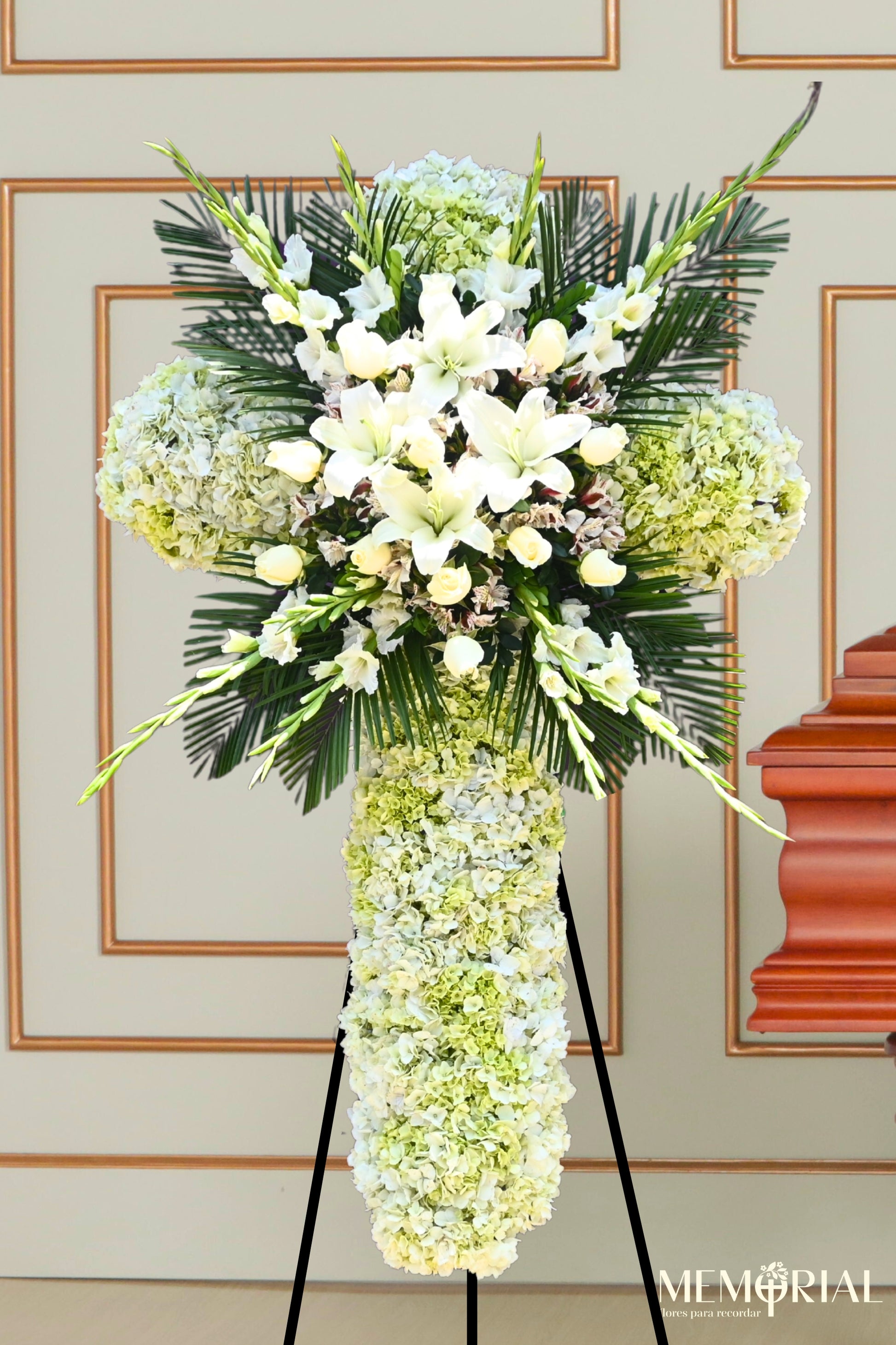 La “Cruz de Condolencias Consuelo Blanco” es un homenaje floral de presencia serena y respetuosa, diseñado para transmitir paz, fe y luz espiritual en los momentos de despedida. Sus tonos blancos y verdes crean un mensaje visual de recogimiento, pureza y esperanza.
