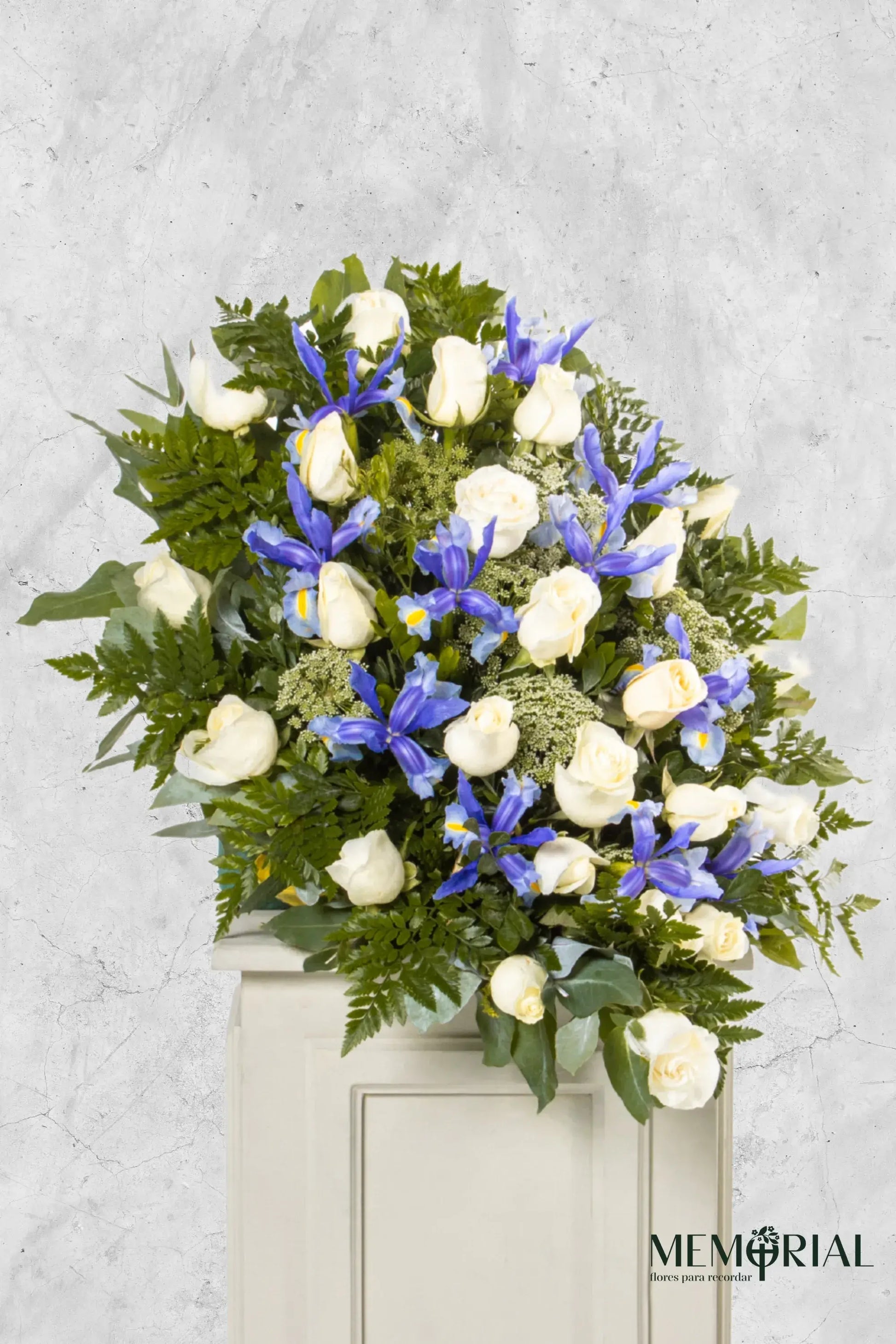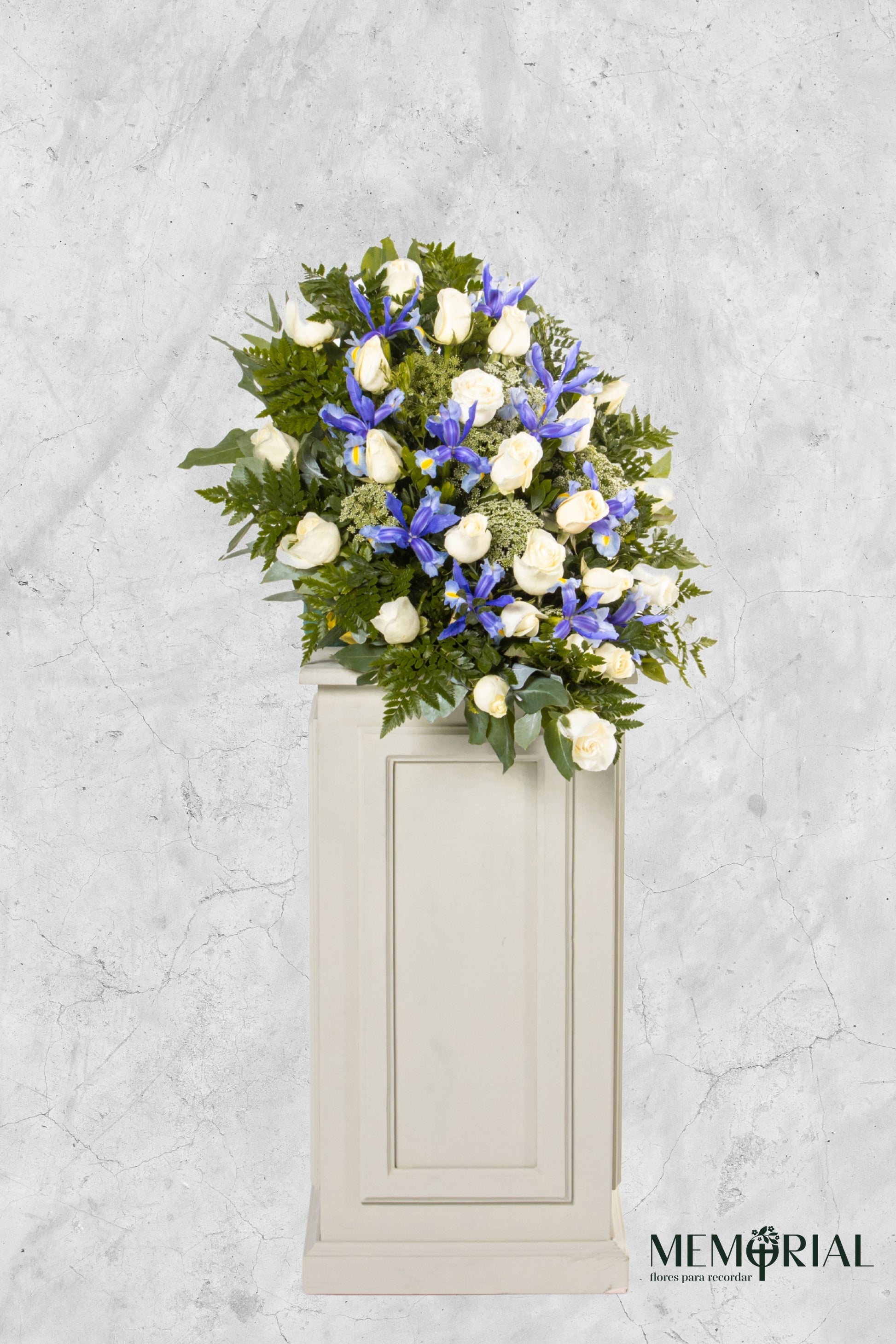 La Lágrima de Piso con Rosas Blancas e Iris es una opción refinada y significativa para expresar tus condolencias en momentos de duelo. Compuesta por 24 rosas blancas, iris y flores de complemento, este arreglo floral ofrece un tributo elegante que simboliza paz y respeto.