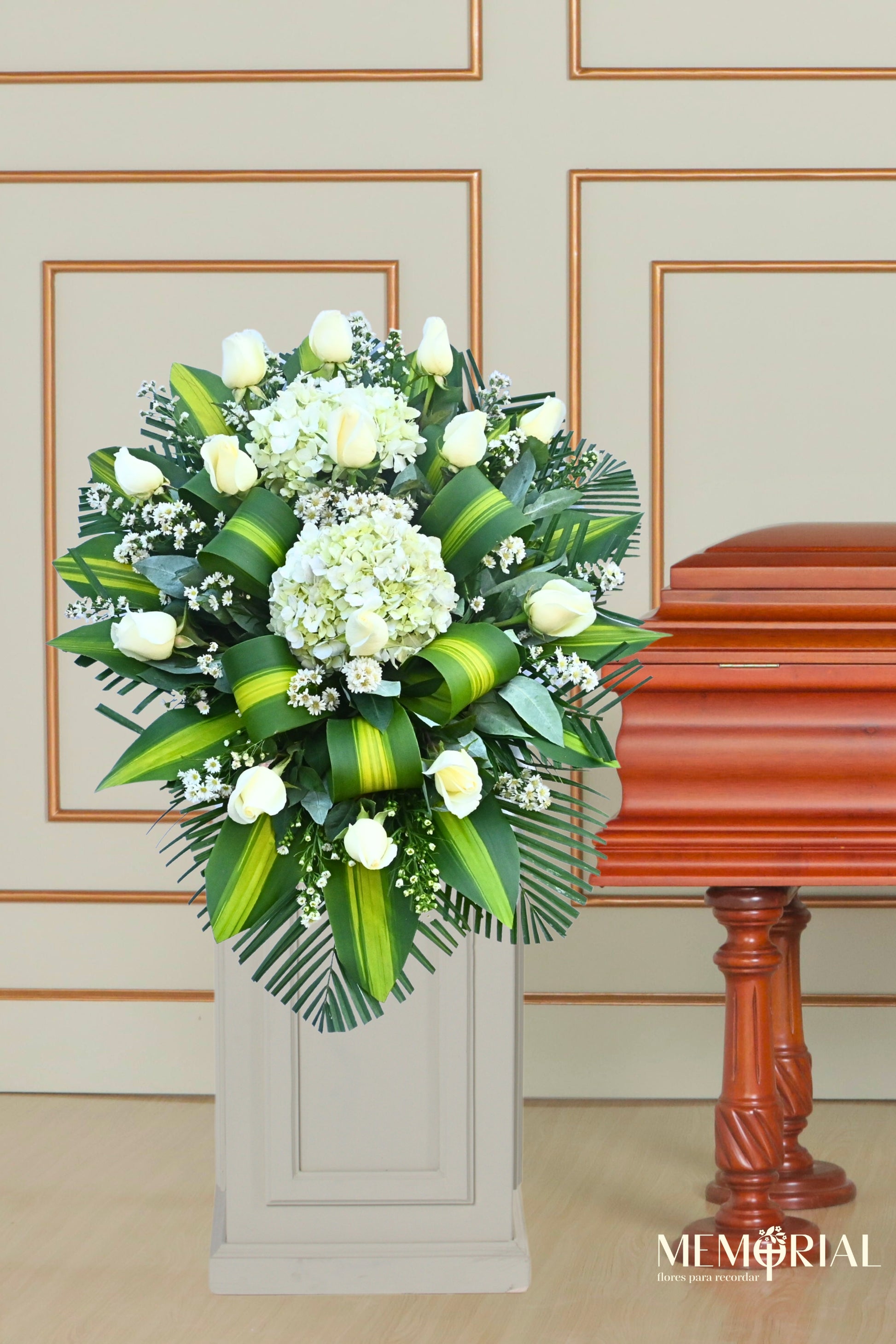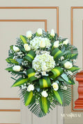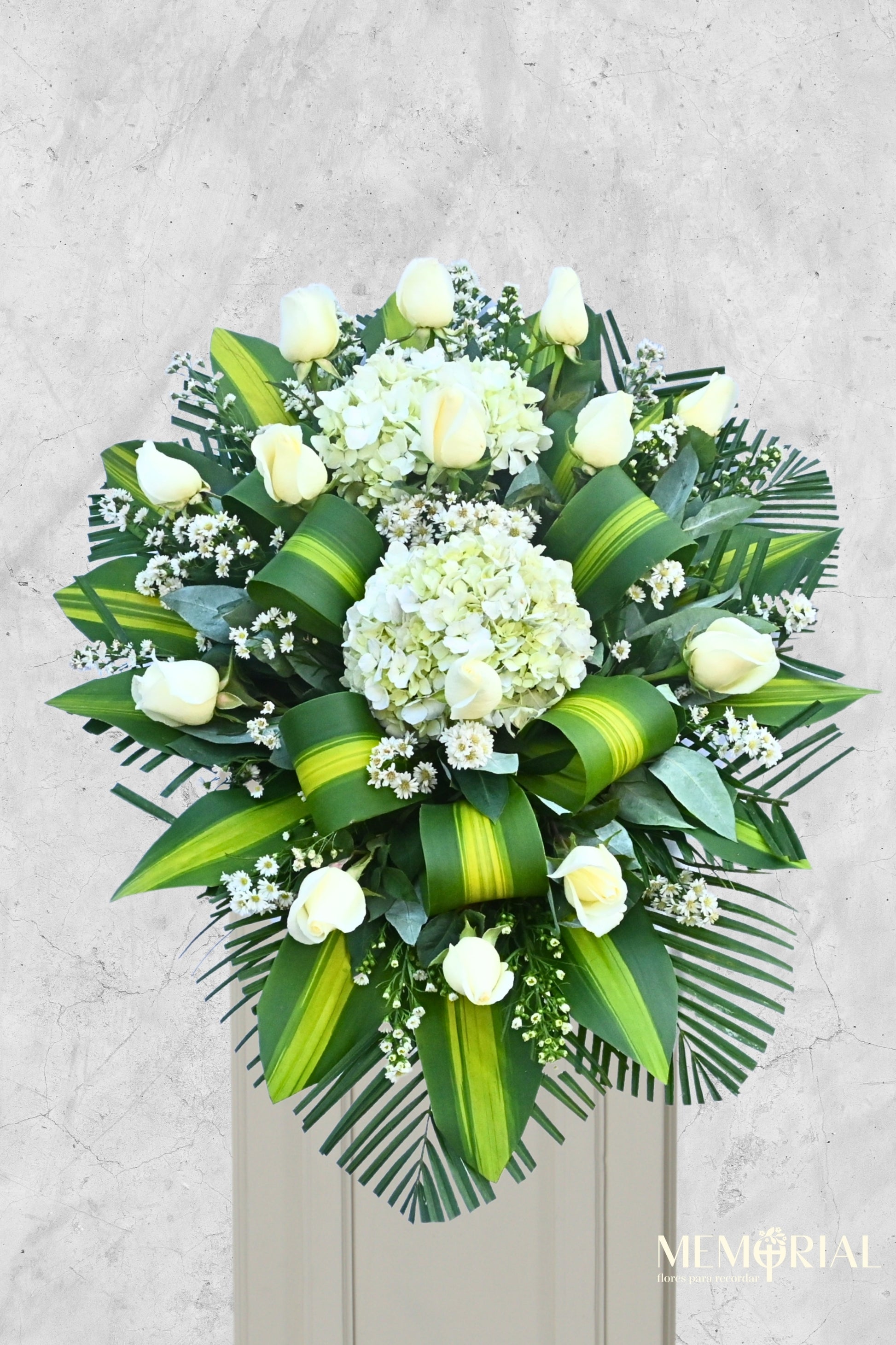 “Consuelo de Paz” es una lágrima floral que simboliza la tranquilidad del alma y el respeto profundo por la vida que se despide. La combinación de flores blancas y verdes transmite esperanza, serenidad y un mensaje de acompañamiento que abraza a la familia en un momento de recogimiento y memoria.