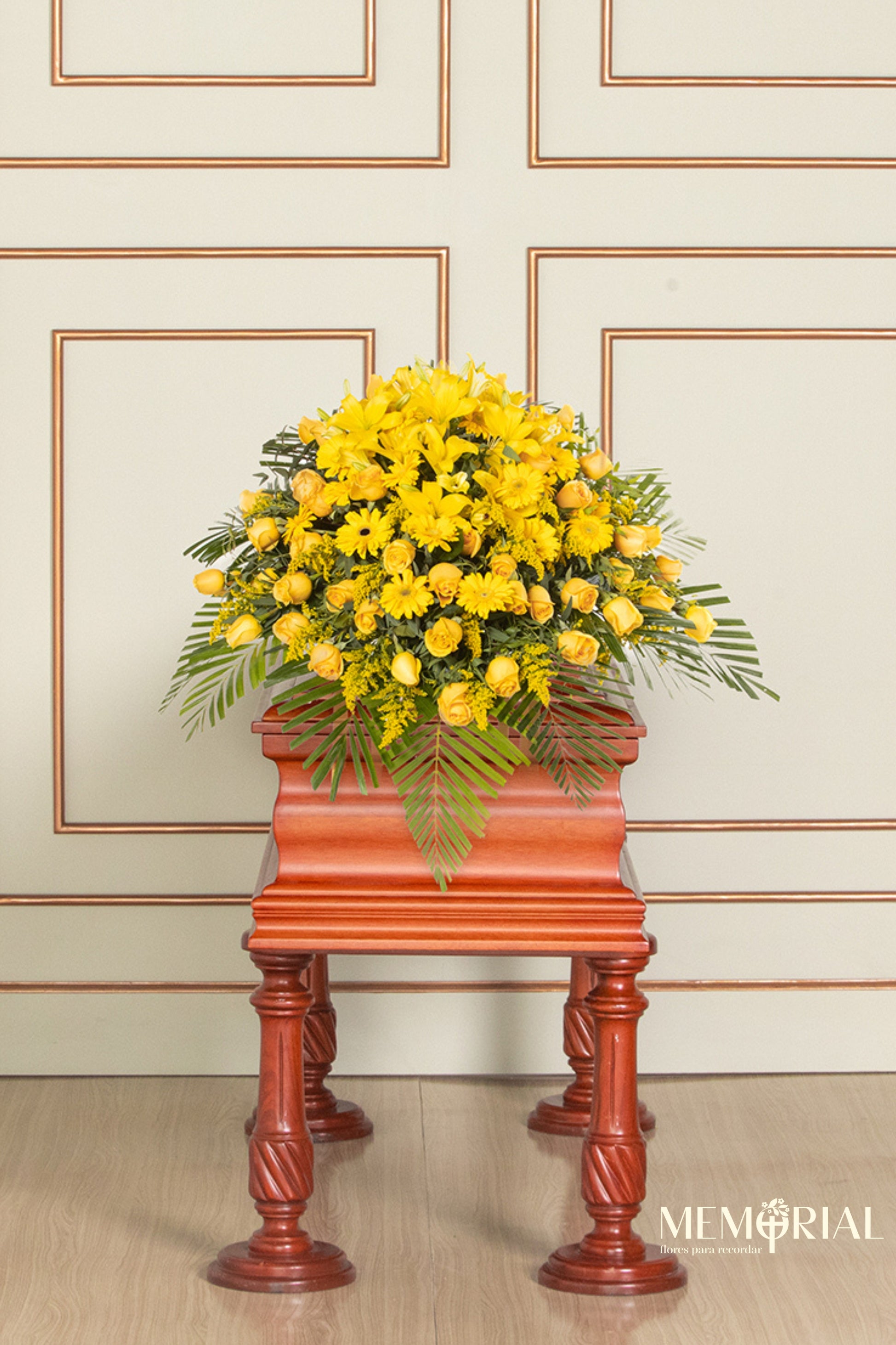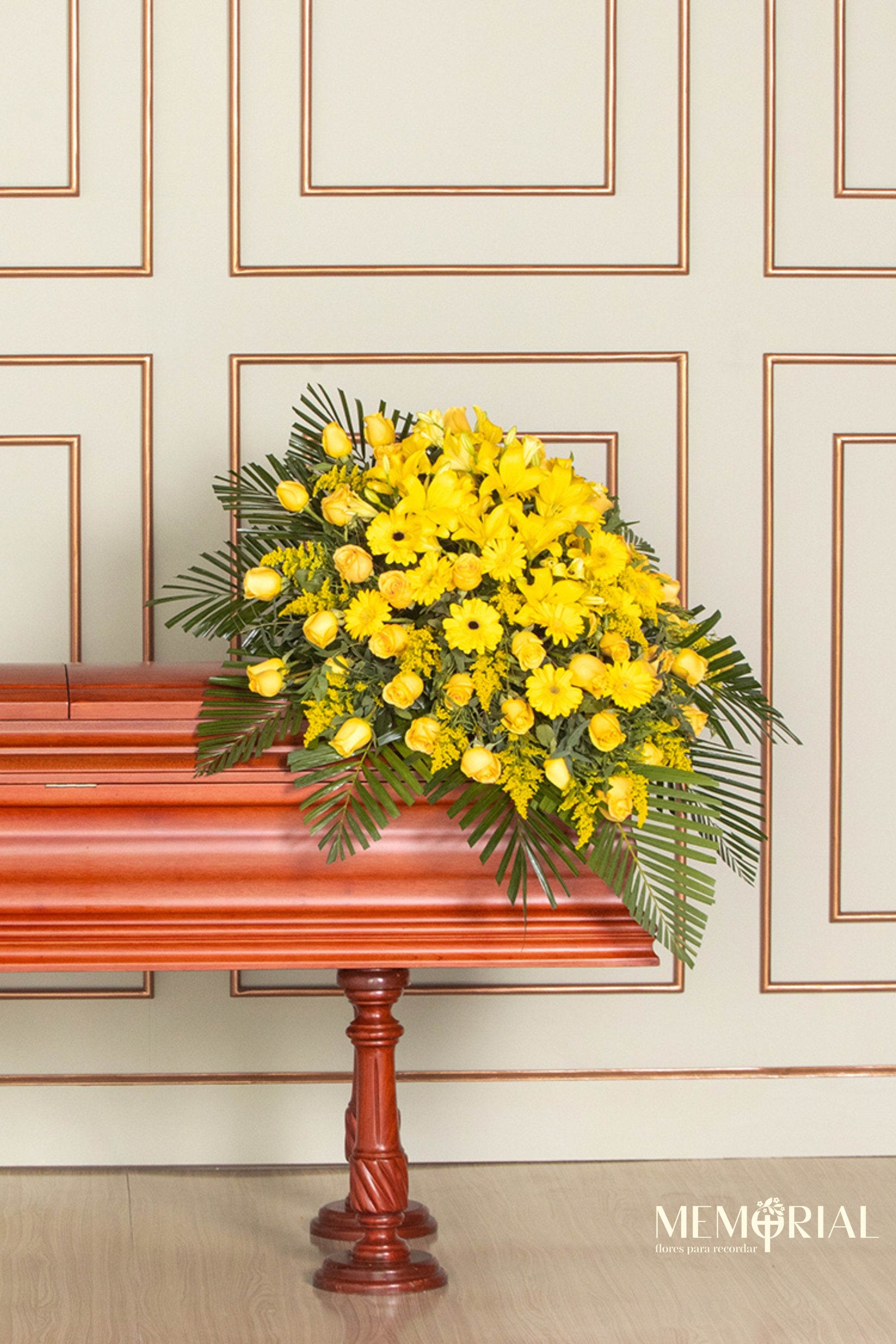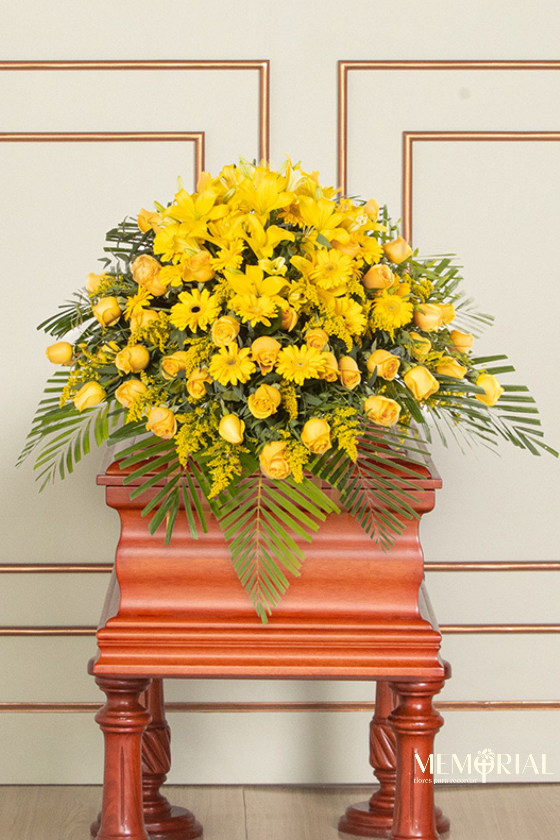 El Manto de Condolencias con Rosas Amarillas y Liliums es un arreglo vibrante y lleno de vida, diseñado para cubrir el cajón en el último adiós. Con 70 rosas amarillas, liliums, gerberas y flores de complemento, este manto es un tributo floral que transmite calidez y respeto.