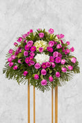 El Manto de Condolencias con Rosas Lilas y Hortensias es un homenaje que irradia serenidad y respeto, ideal para cubrir el cajón del ser querido. Con 70 rosas lilas, hortensias, margaritas y flores de complemento, este arreglo ofrece un tributo floral lleno de paz y belleza.